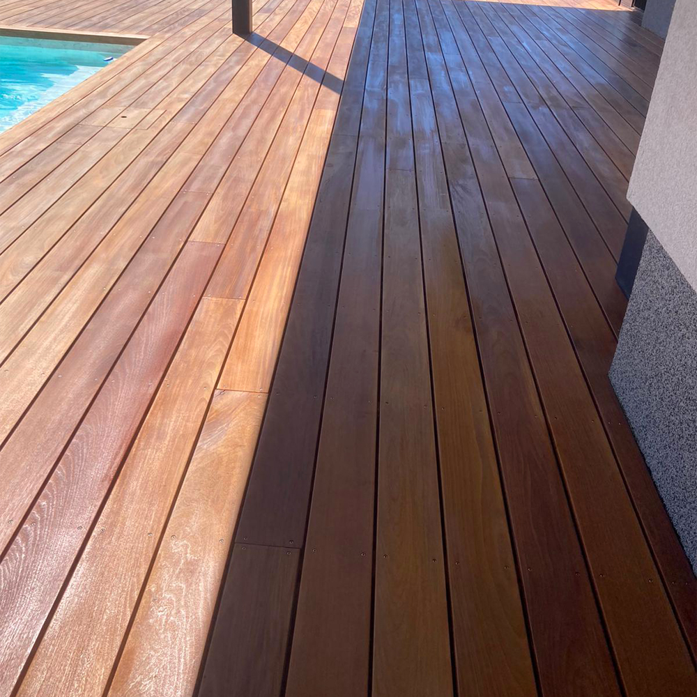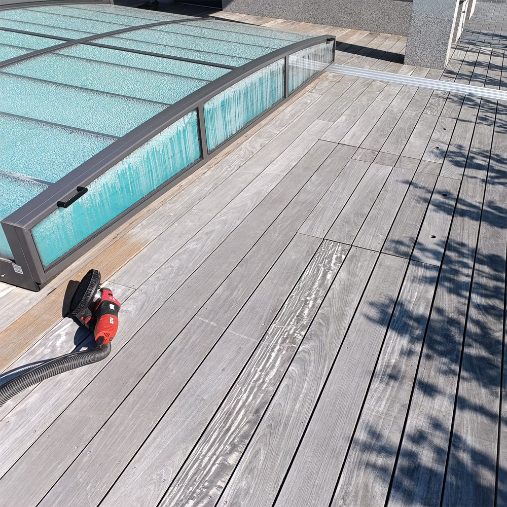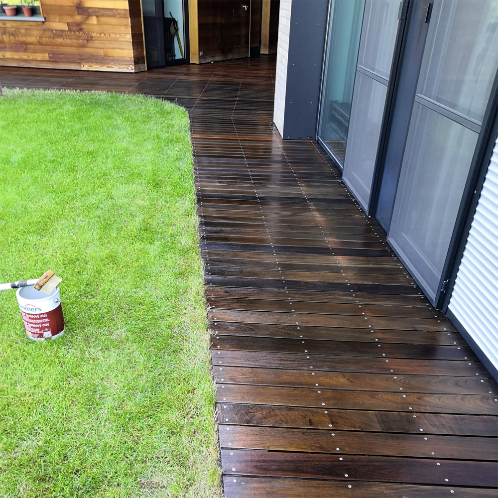 Pokud se rozhodnete pro terasu z IPE, doporučuje se dřevo ošetřit speciálními oleji, aby si zachovalo svůj vzhled. Bez ošetření se na povrchu časem vytvoří šedo-stříbrná patina, která však neovlivňuje jeho kvalitu/životnost.
